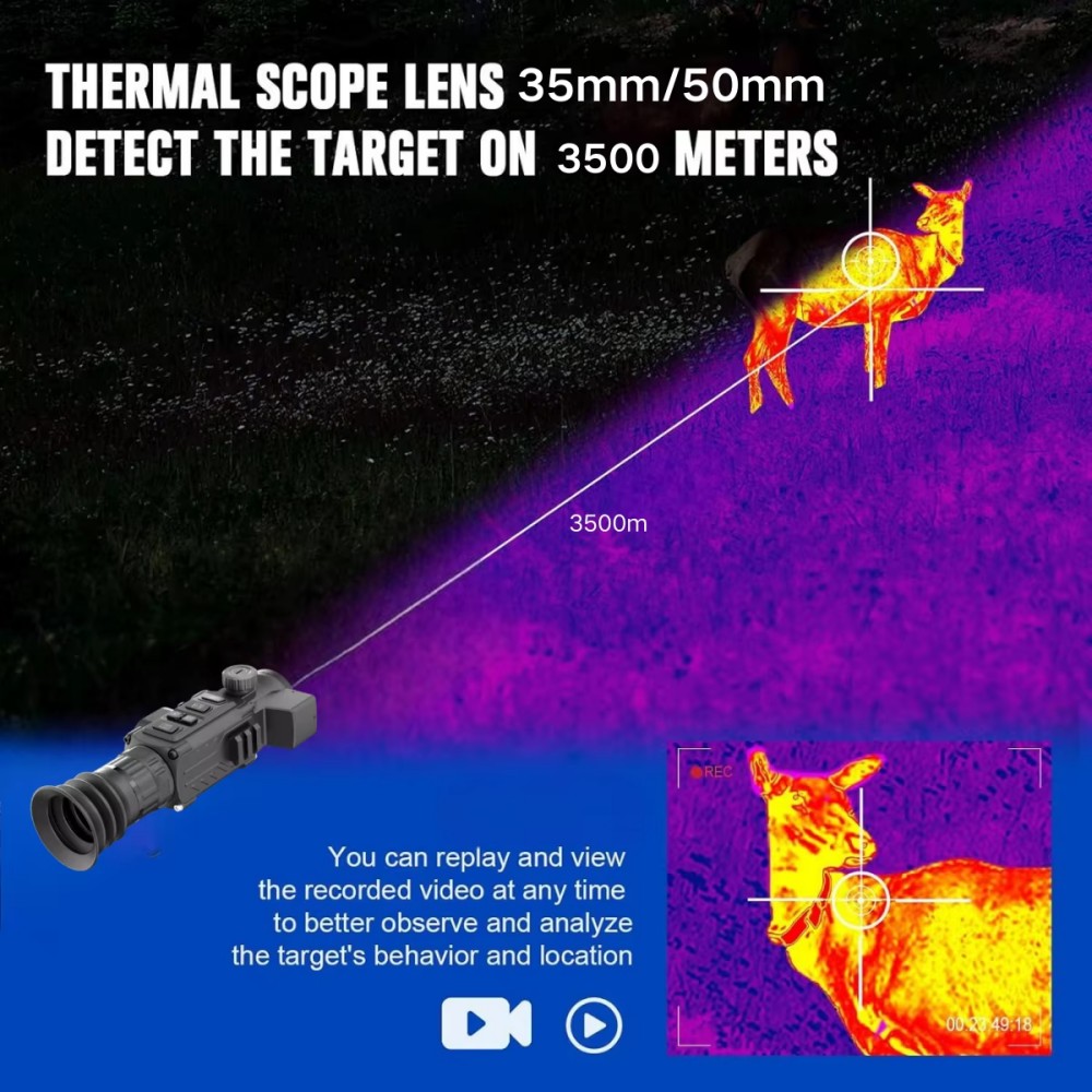The thermal imaging scope is equipped with a 640*512 VOx uncooled detector and a 50 mm F1.0 lens, Frame rate 50Hz,A large field of view of 8.7°x7.0°,providing ultra-clear and detailed infrared thermal images for both day and night use. The detection range for humans is 3500 m, and the recognition range is 590 m., this thermal scope ensures users can spot and identify targets at long distances with confidence.