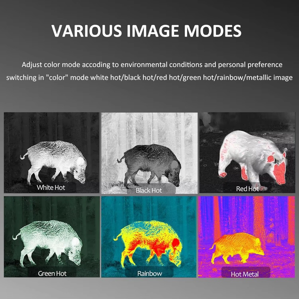 The supports digital zoom 1x/2x/4x, multiple color palettes (White Hot/Black Hot/Red Hot/Fusion/Golden Hot etc). With WiFi transmission, video & audio recording, snapshots, this thermal scope also works as a thermal monocular and thermal imaging camera for outdoor adventures.