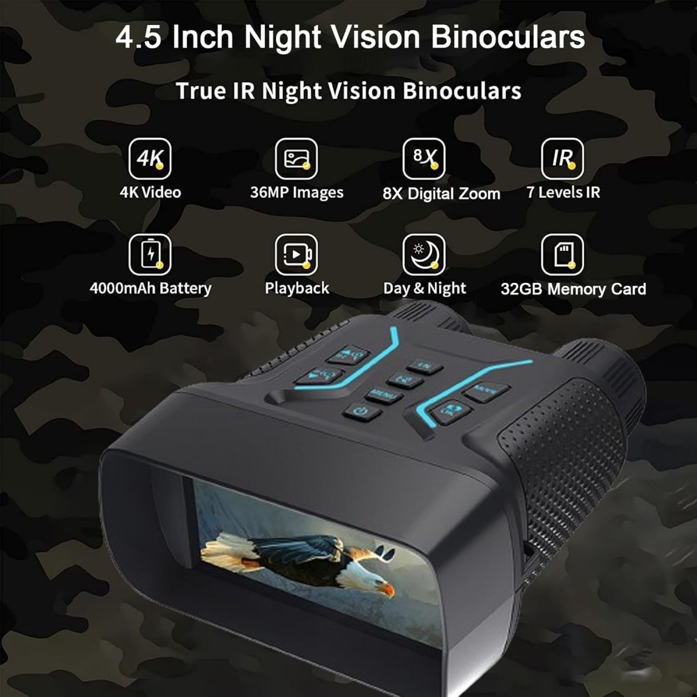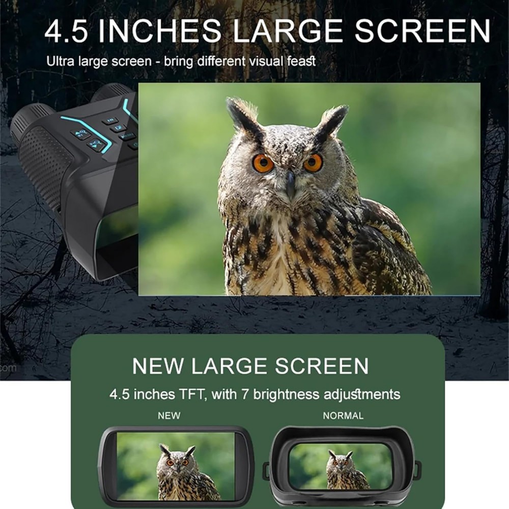 ★Portable & User-Friendly Design: Compact and lightweight at just 470g, this binocular night vision device is easy to carry and operate. It features an intuitive 4.5-inch TFT display with 7 levels of brightness adjustment, ensuring a clear view under any lighting condition. The TYPE-C USB interface and included 32GB TF card make file transfer and storage a breeze.
