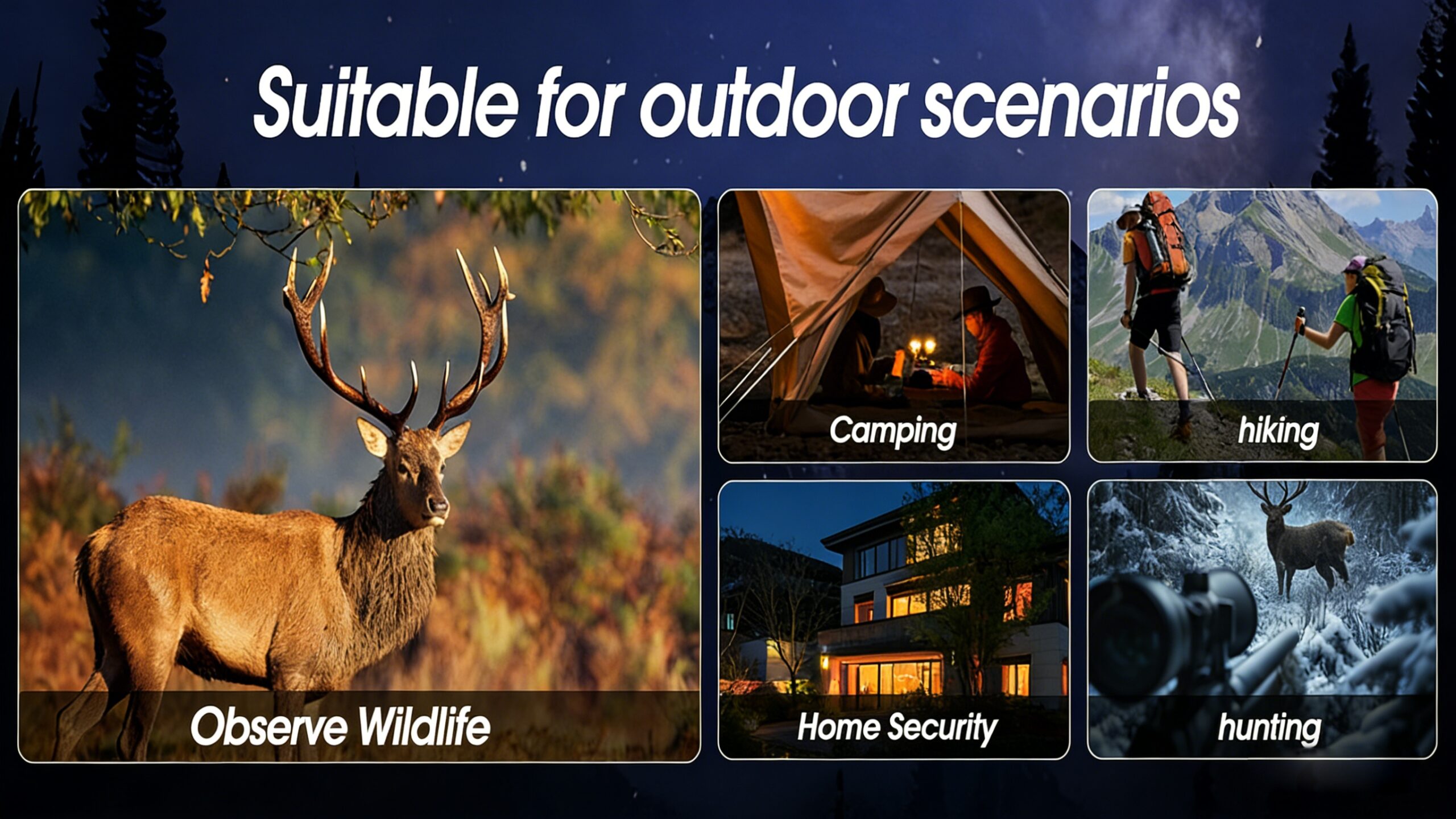 Day and night use, Observation distance of 500 meters in complete darkness, and 1 meter to infinity in low light.