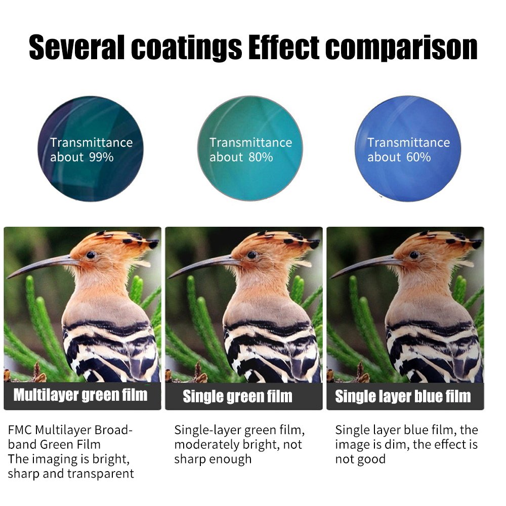 The lens are all fully multi-coated and features BAK4 roof prism to increases light transmission and delivers bright, clear, high-contrast images even in low-light conditions. For long range viewing, focus wheel system enables fast and fine-tuning focus adjustment,allows you to lock onto your target and zoom in for more detail clearly