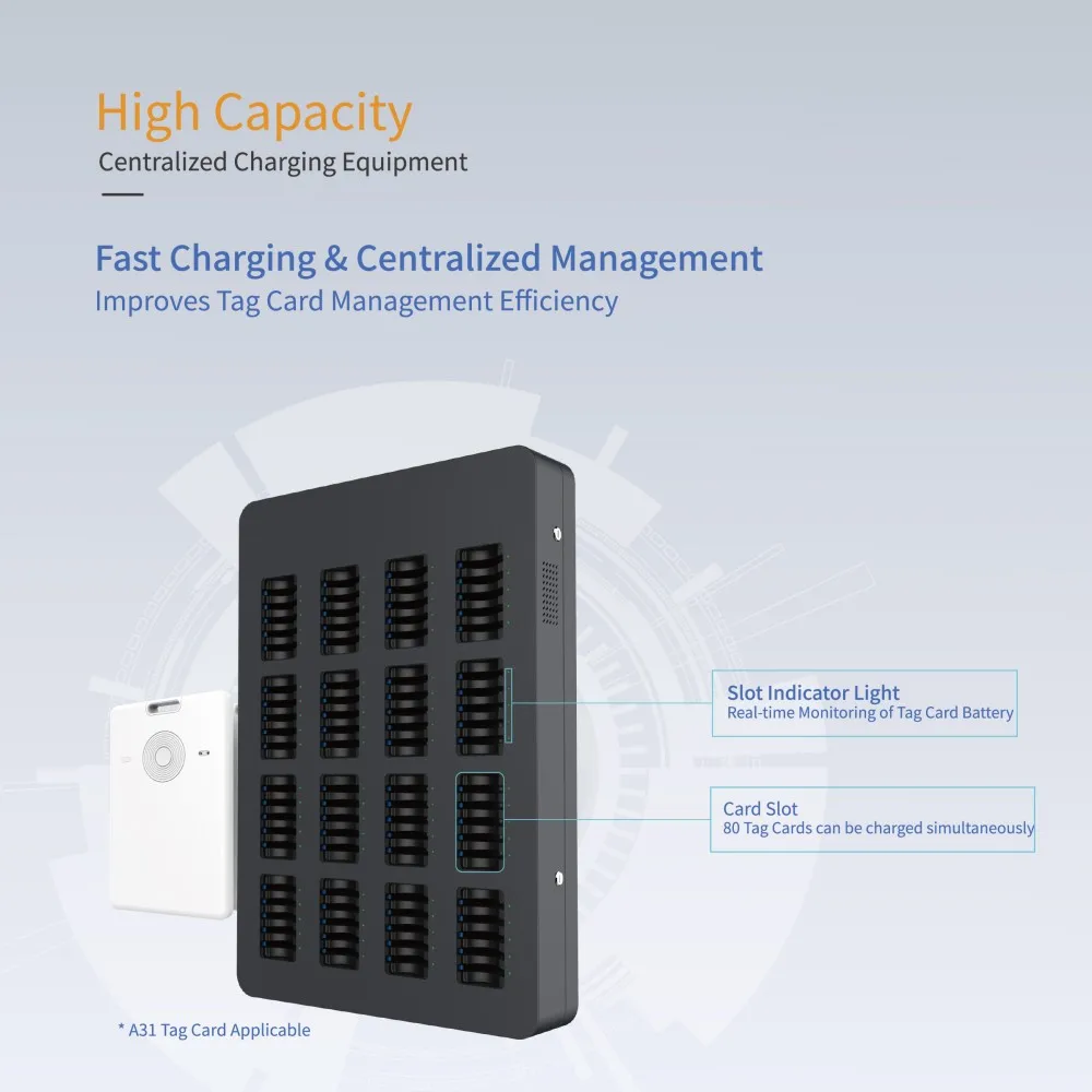 Equipped with 80 dedicated card slots, this equipment supports simultaneous charging of up to 80 A31 tag cards, perfectly meeting the demand for large-scale tag card management in professional facilities.